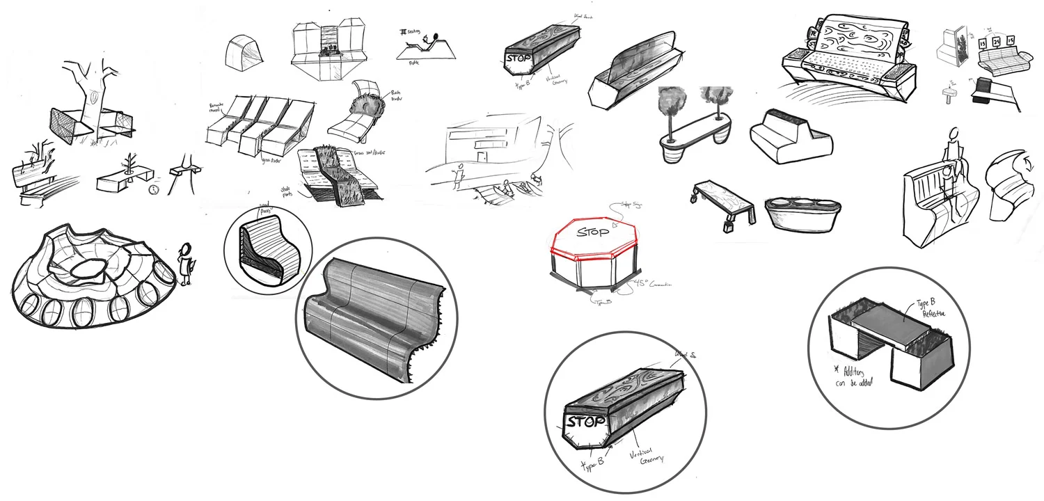 How might we design a piece of furniture made from reclaimed wood materials for city plazas that is..